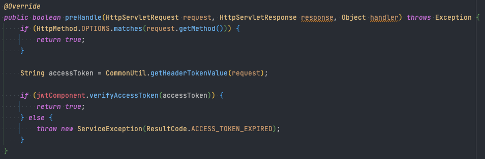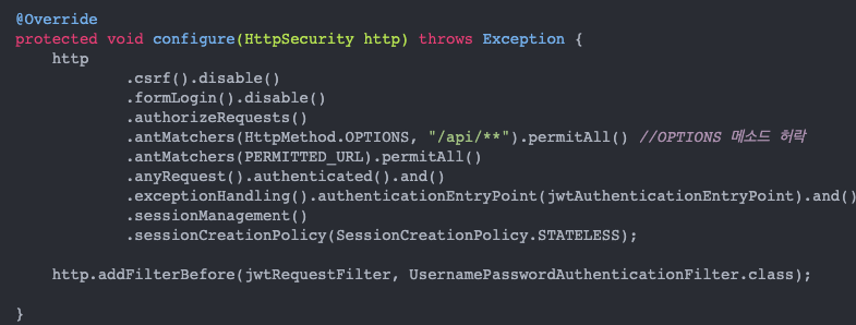 따라서, CORS 환경에서 위와 같은 처리를 하는 경우 OPTIONS Method는 interceptor단에서 정상 처리로 넘기던가 SpringSecurity에서 OPTIONS 요청은 permitAll()을 적용 해주어야 한다.