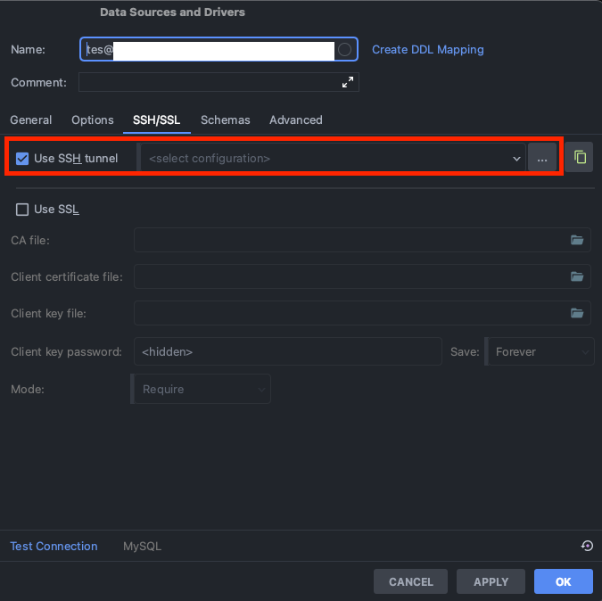 5. Database: 초기 DataBase명 입력경고 문구가 신경쓰이는 경우 Ignore 클릭 & 전부 입력 후에, 상단 'SSH/SSL' Tab 클릭