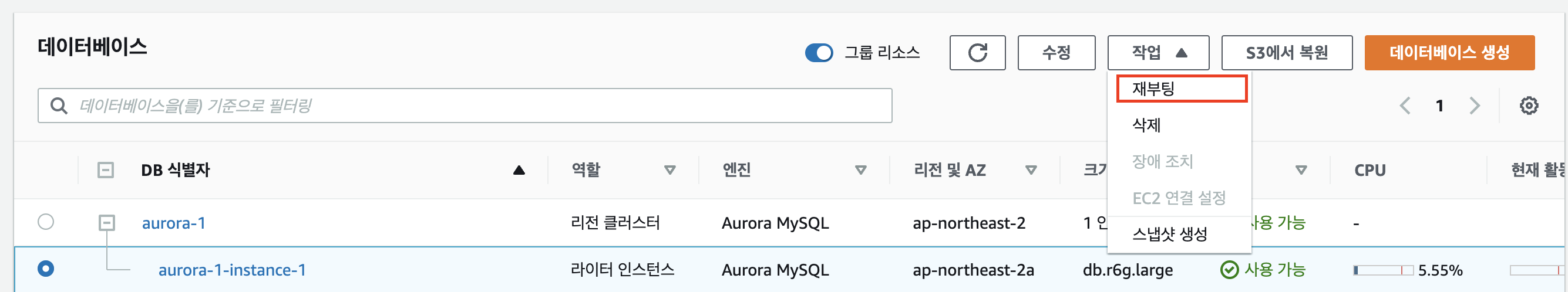 클러스터 파라미터 그룹을 변경했기 때문에 라이터 인스턴스를 재부팅 해준다.