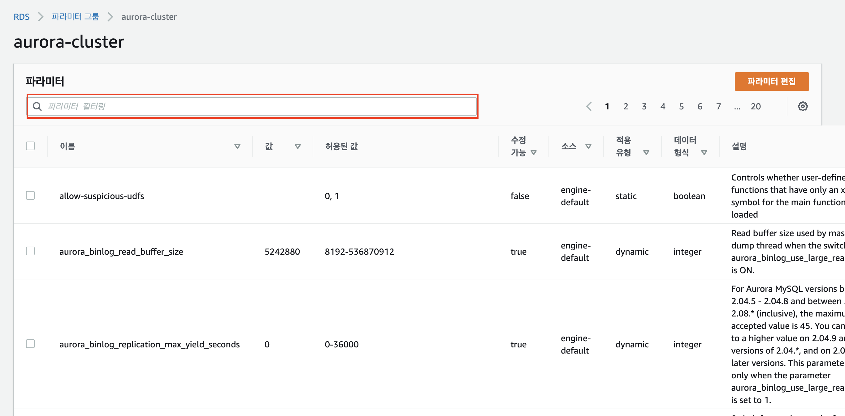 생성한 클러스터 파라미터 그룹을 클릭하여 상세 페이지로 들어와서 '파라미터 필터링' 검색을 통해 필요한 옵션의 값을 수정할 수 있다.