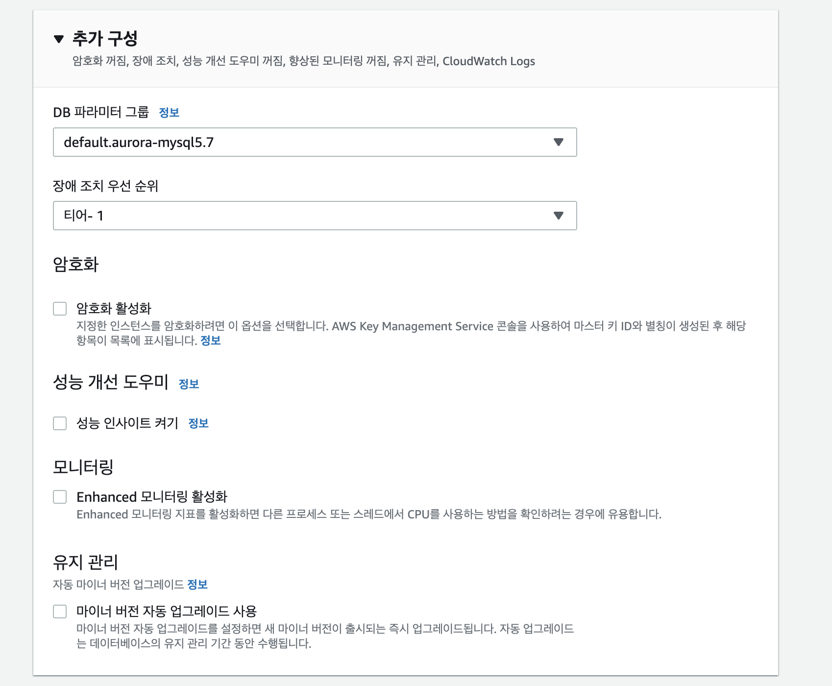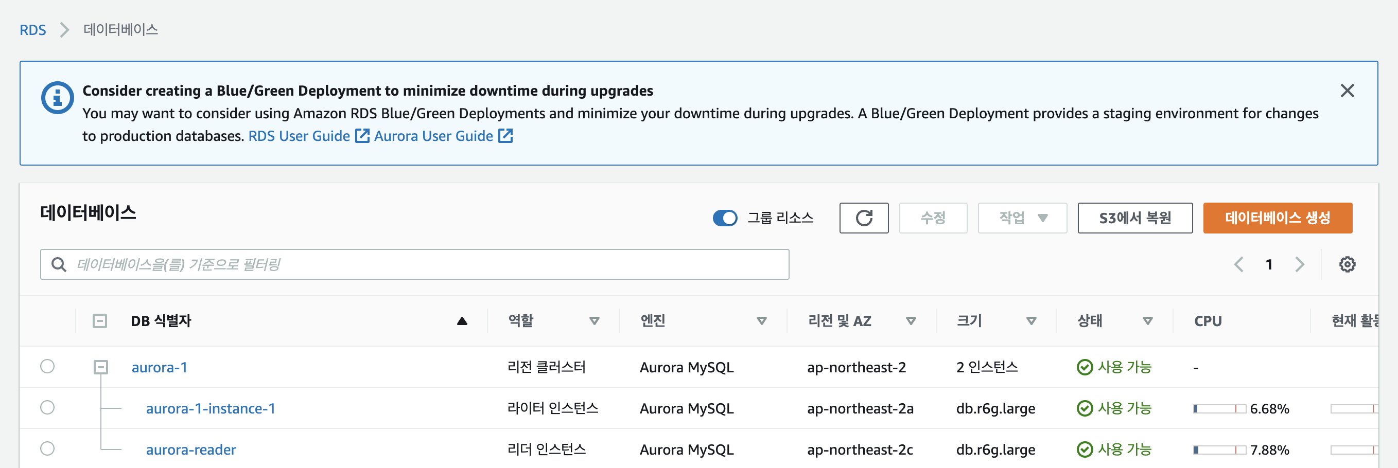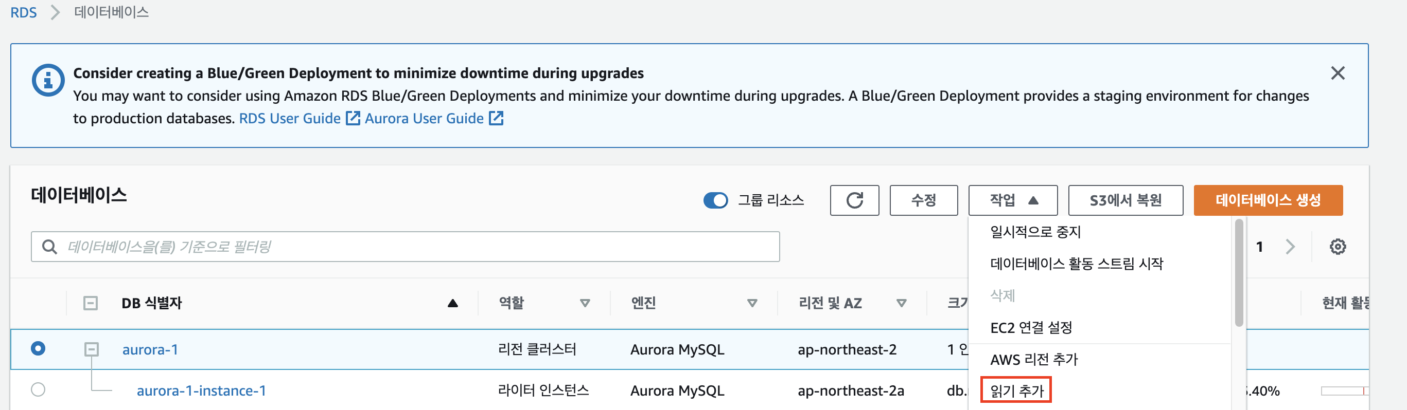 이번 포스팅에선 Aurora Read Instance(읽기 전용)를 추가하고