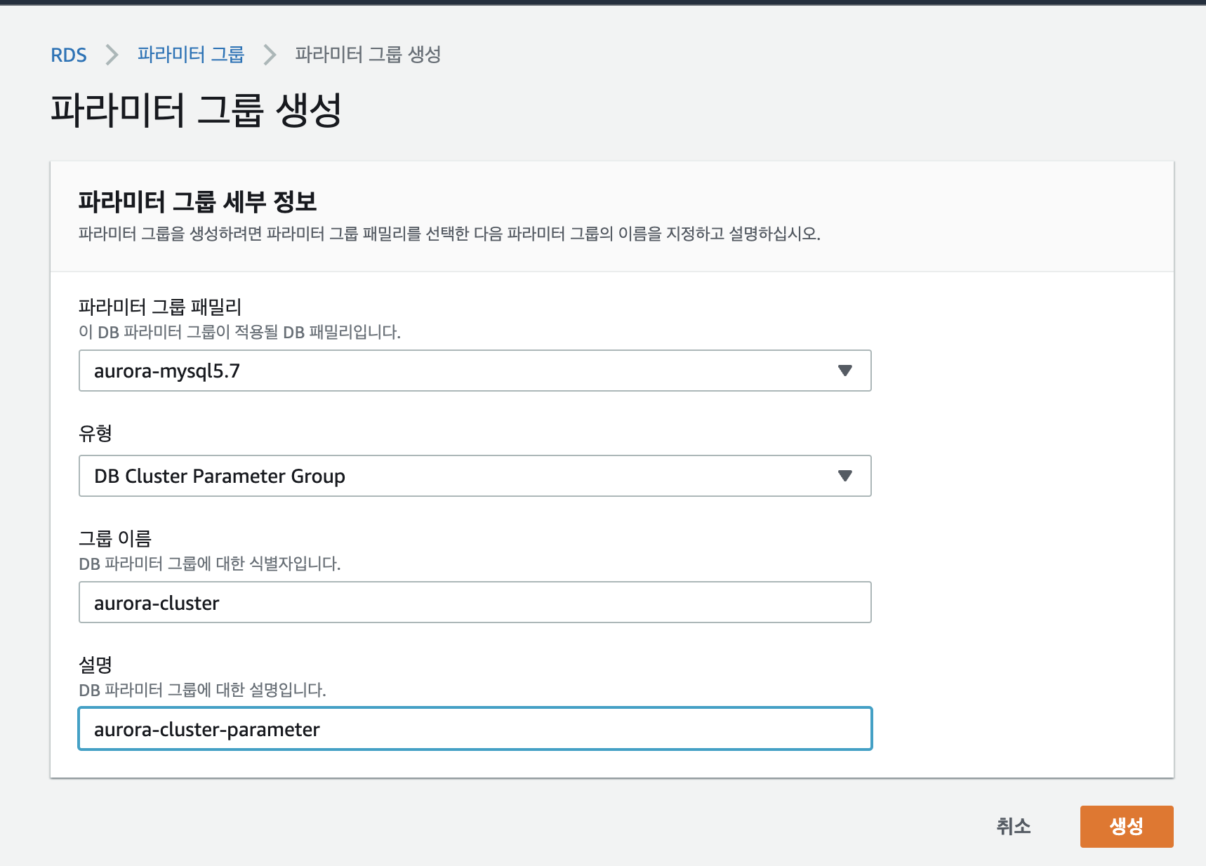 유형은 DB Cluster Parameter Group으로 선택하여 클러스터 파라미터 그룹 생성