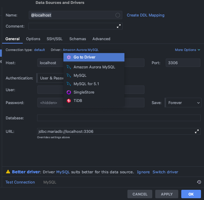 Amazon Aurora MySQL로 Driver를 변경하자.