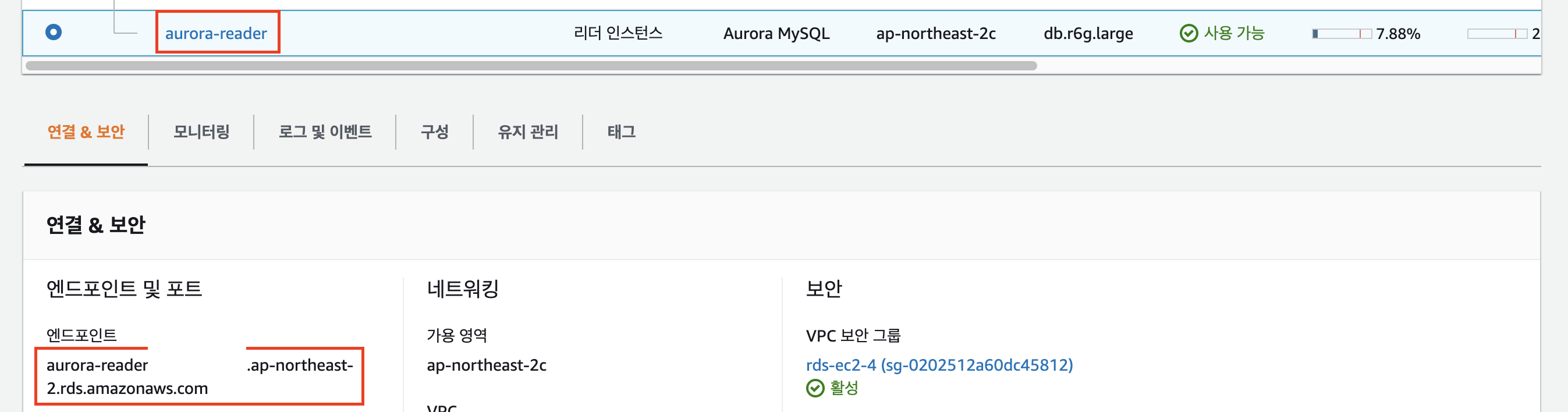 엔드포인트를 통해서 읽기 인스턴스에 접속 할 수 있으며 서비스 용도의 애플리케이션에서는 ro 가 붙은 클러스터 읽기 엔드포인트 를 통해 접속해야 한다. 물론 쓰기 인스턴스로 접속을 위해서도 클러스터 쓰기 엔드포인트 로 접속을 해야 한다.