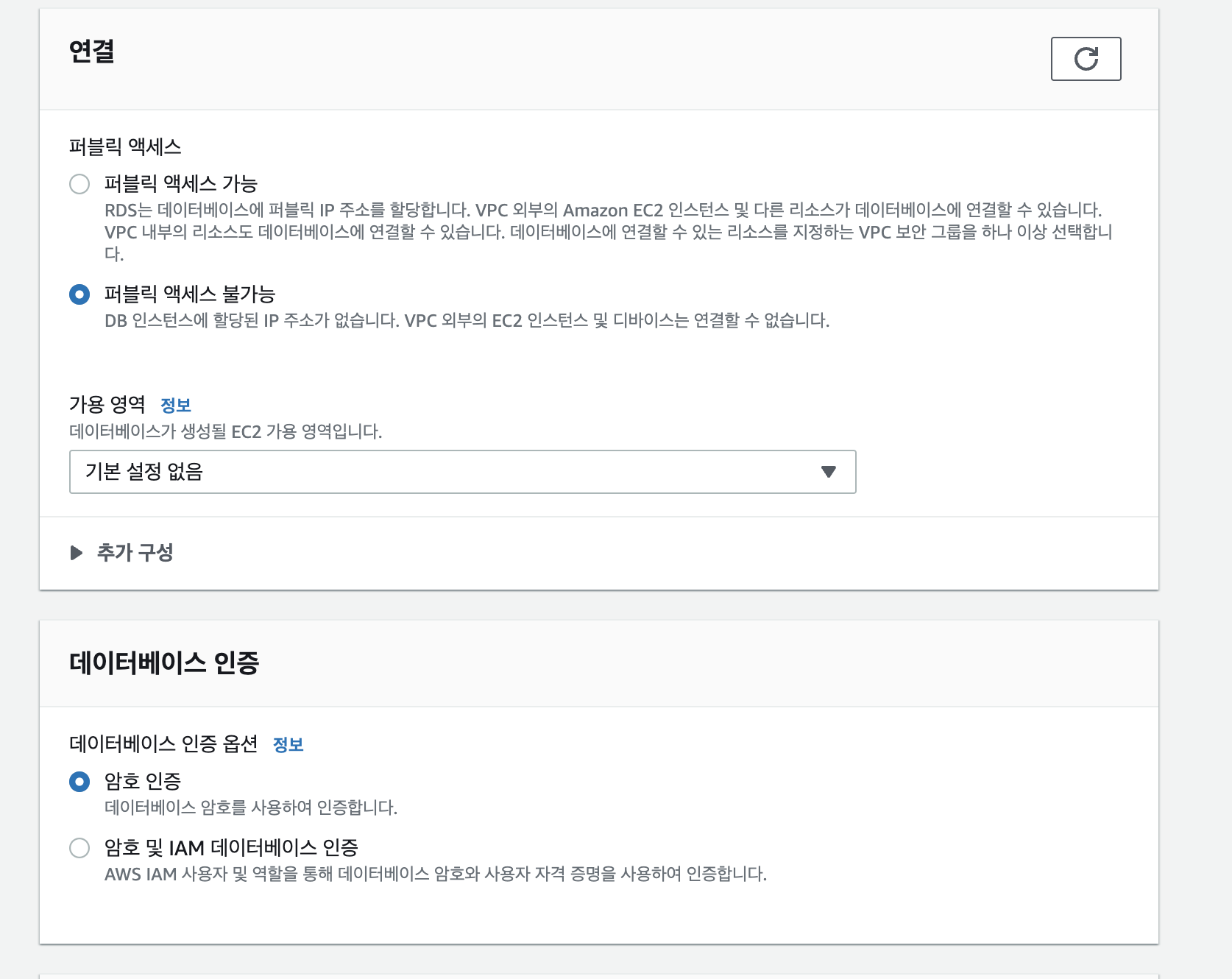 연결 항목에서는 퍼블릭 엑세스 가능 여부 와 가용 영역(AZ) 를 선택 할수 있으며 포트는 변경이 불가능하다.