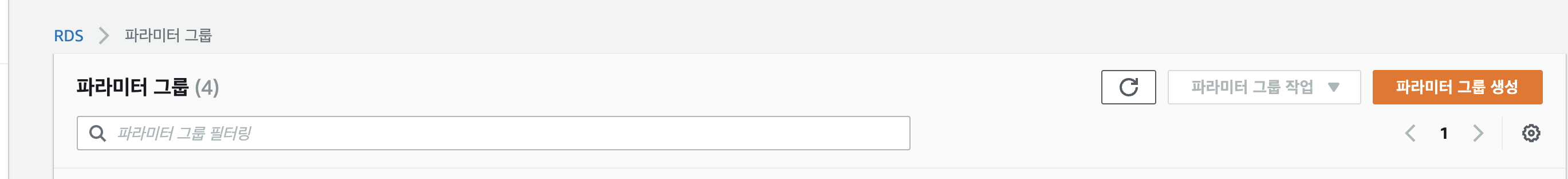 생성한 클러스터 파라미터 그룹을 클릭하여 상세 페이지로 들어와서 '파라미터 필터링' 검색을 통해 필요한 옵션의 값을 수정할 수 있다.