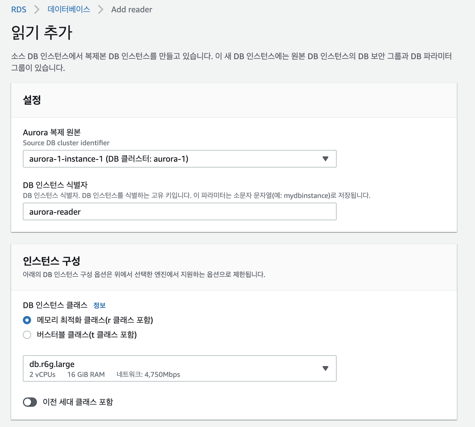 이번 포스팅에선 Aurora Read Instance(읽기 전용)를 추가하고