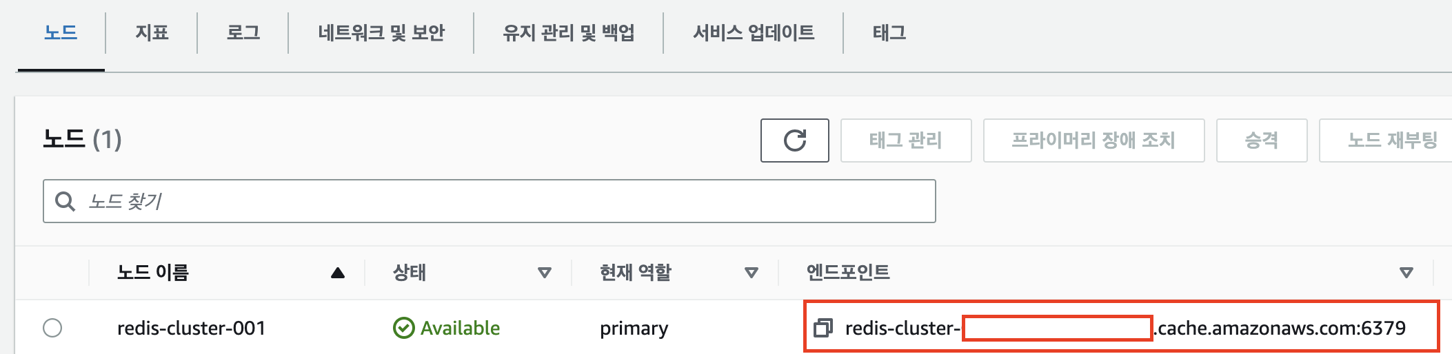 ElastiCache > Redis 클러스터 에서 노드를 선택하여 엔드포인트를 복사한다.
