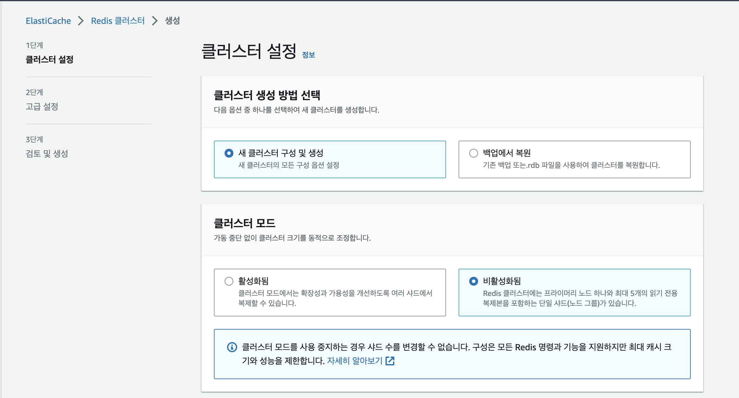 본 포스팅에선 테스트 목적이기 때문에 클러스터 모드 '비활성화' 선택