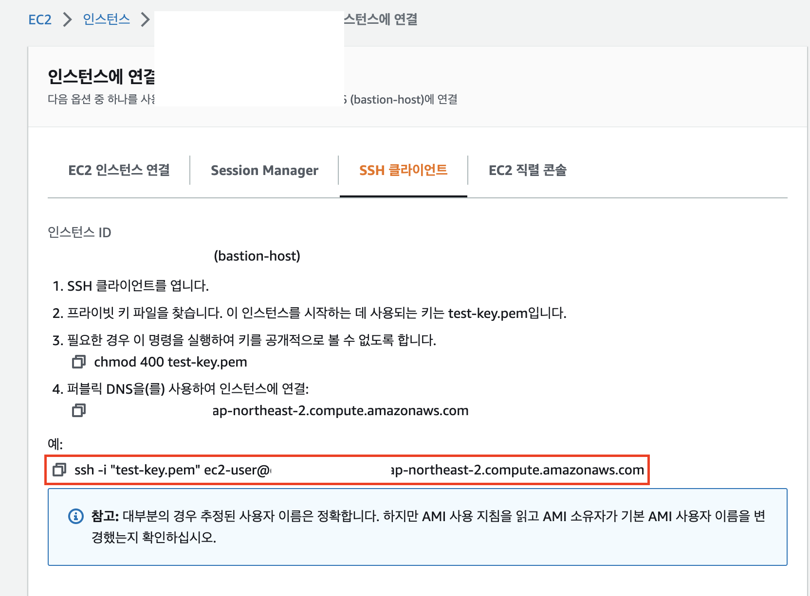 EC2 > bastion-host > '연결' Tab을 클릭하여 위 화면에 접근한다.