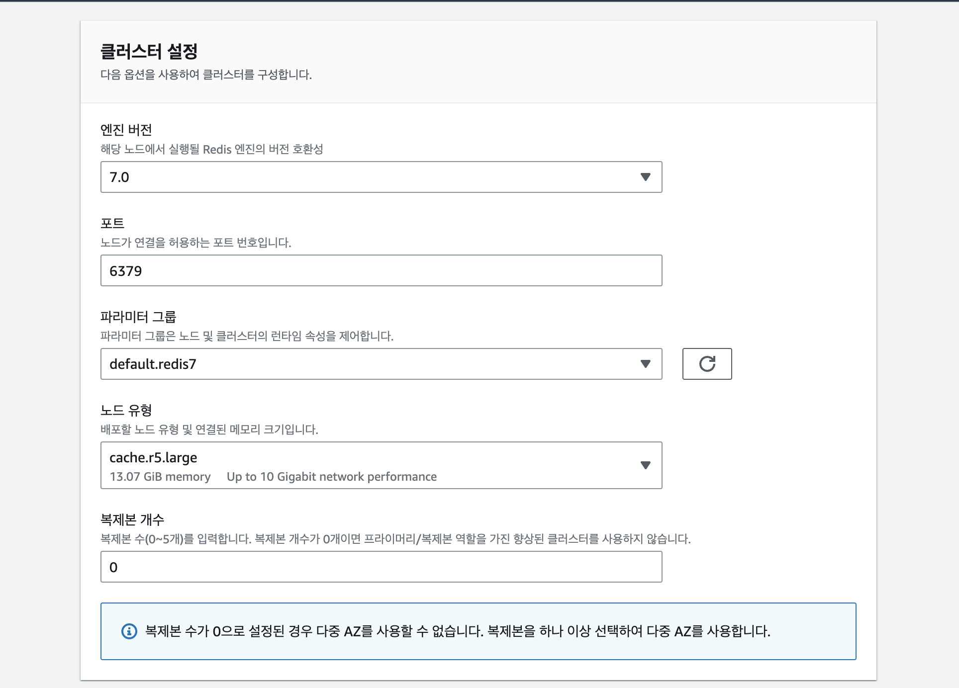 테스트 목적이므로 낮은 메모리 크기인 cache.r5.large 선택