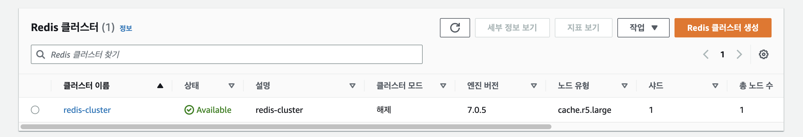 Elasticache > Redis 클러스터 > Redis 클러스터 생성 클릭하여 화면 진입