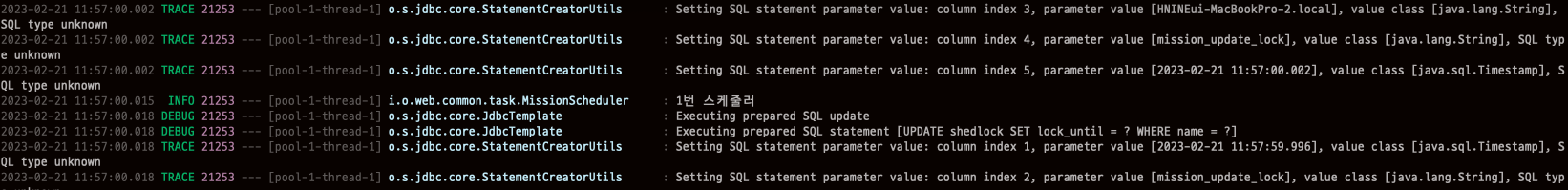 @Slf4j @Component public class MissionScheduler { @Scheduled(cron = "0/10 * * * * *") // 0초부터 10초마다 실행 @SchedulerLock( name = "scheduler_lock", // 스케줄러 락 이름 지정. (이름이 동일한 스케줄러일 경우, 락의 대상이 된다.) lockAtLeastFor = "PT9S", // 락을 유지하는 시간을 설정한다. (9초로 설정했는데, 스케줄러 주기보다 약간 짧게 지정하는 것이 좋다.) lockAtMostFor = "PT9S" // 보통 스케줄러가 잘 동작하여 잘 종료된 경우 잠금을 바로 해제하게 되는데, 스케줄러 오류가 발생하면 잠금이 해제되지 않는다. 이런 경우 잠금을 유지하는 시간을 설정한다. ) public void scheduler1() { log.info("1번 스케줄러"); } }- name: 스케줄 작업의 고유 이름. 해당 문자열은 shedlock 테이블의 name 칼럼으로 기본키 역할을 하게 되므로 스케줄 작업의 고유한 이름을 입력해야한다.