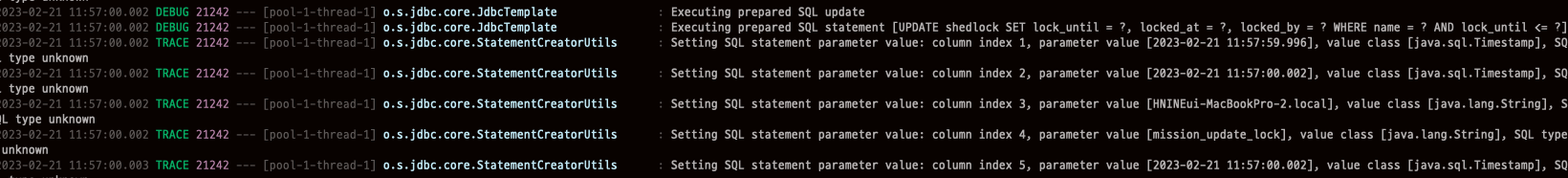시기를 결정하는 데 사용된다. 현재 시간이 벗어나면 ShedLock은 작업 실행을 건너뛰고 경고를 기록한다. - ShedLock은 Lock 데이터베이스 테이블에 레코드를 삽입하여 예약된 작업에 대한 잠금을 획득하려고 시도한다.