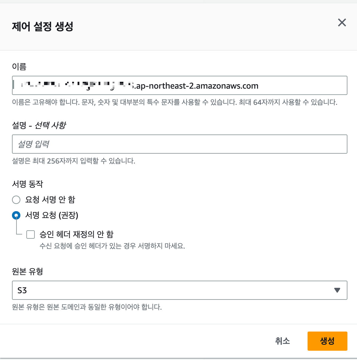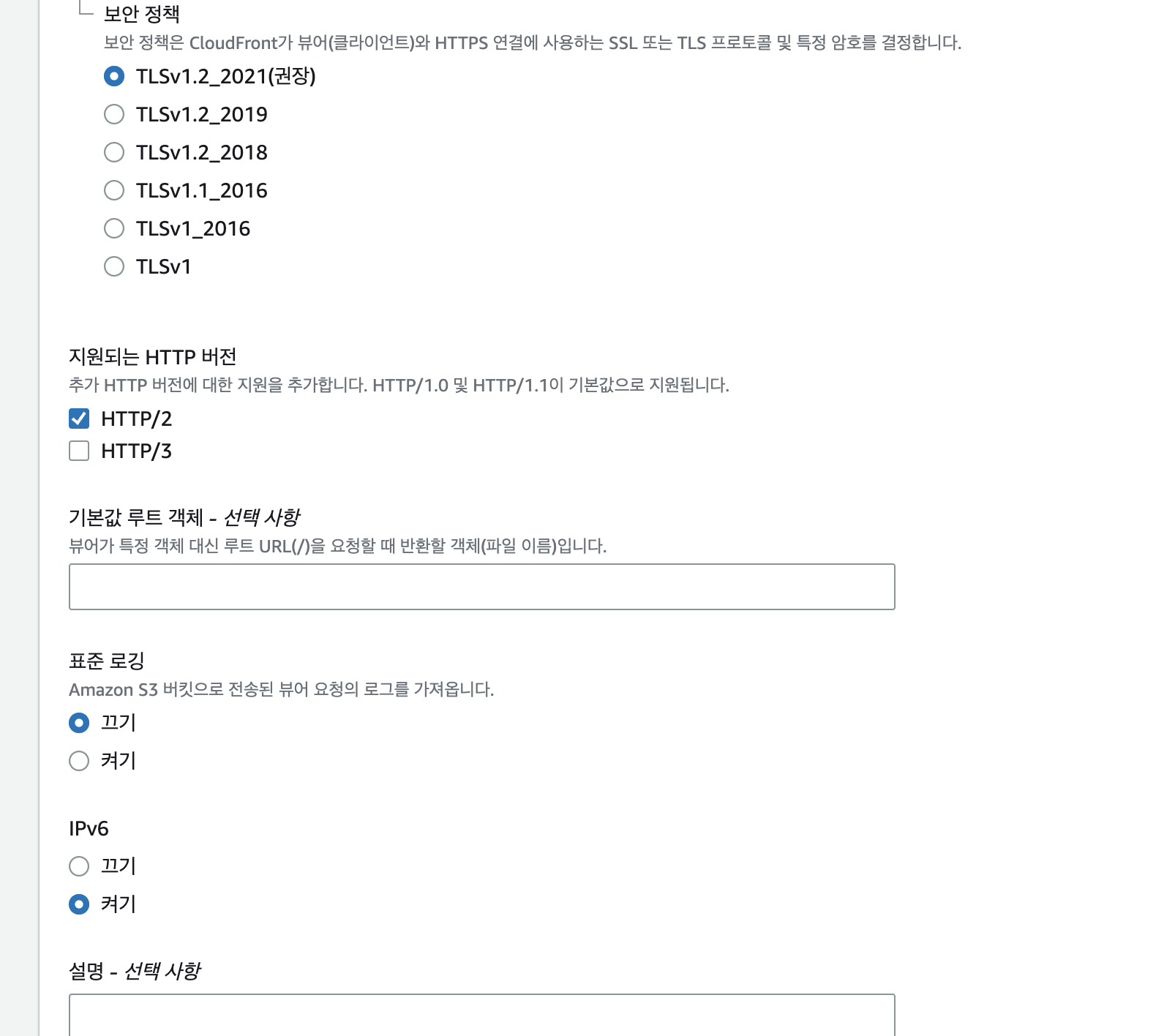 3. CloudFront 배포 생성 원본 도메인명을 입력하고, S3 버킷 액세스는 '원본 액세스 제어'로 설정 합니다.  서명 요청을 선택 하고, 원본 유형은 S3로 지정합니다.  기본값으로 설정합니다.  💡 뷰어 프로토콜 정책을 Redirect HTTP to HTTPS로 설정 합니다. - HTTP 요청이 CloudFront로 들어오면, CloudFront는 요청을 HTTPS로 리다이렉션하여 보안 연결을 강제합니다. - HTTPS는 데이터를 암호화하여 전송하므로, 사용자의 데이터 보안을 강화할 수 있습니다. 또한 HTTPS를 사용하는 것은 검색 엔진 최적화(SEO) 측면에서도 이점이 있습니다. 💡 허용된 HTTP 방법을 GET, HEAD로 설정 합니다. - CloudFront에 대한 HTTP 요청 중 GET 및 HEAD 메서드만 허용합니다. 즉, POST, PUT 등의 메서드는 허용되지 않습니다. - 보안 상의 이유로 HTTP GET 및 HEAD 요청만 허용하면, 악의적인 요청에 의한 보안 위협을 줄일 수 있습니다. 필요한 HTTP 메서드만 허용함으로써 웹 애플리케이션의 안정성을 높일 수 있습니다. 💡 뷰어 액세스 제한은 NO로 설정 합니다. - 뷰어 액세스 제한을 사용하지 않음을 나타냅니다. 즉, 특정 IP 주소, 국가, 또는 기타 제한 조건에 따른 액세스 제어를 하지 않음을 의미합니다. - 액세스 제한을 사용하지 않으면 모든 사용자가 CloudFront에서 콘텐츠를 볼 수 있습니다. 단순한 콘텐츠 전송을 위한 경우에 유용하며 추가적인 액세스 제어가 필요 없는 경우에 설정합니다. 💡 캐시 키 및 원본 요청은 Cache Policy and origin request policy로 설정하고 CachingOptimized 정책을 선택합니다. - CloudFront 캐시 정책(Cache Policy) 및 오리진 요청 정책(Origin Request Policy)으로 "CachingOptimized"를 사용합니다. 이는 CloudFront가 최적의 캐시 행동을 수행하도록 지시하는 설정입니다. - CachingOptimized 캐시 정책을 사용하면, 콘텐츠의 최적의 캐싱과 캐시된 콘텐츠의 유효성을 유지하면서 원본 서버에 지속적인 요청을 줄일 수 있습니다. 이로 인해 더 효율적이고 빠른 콘텐츠 전송이 가능해집니다.  미리 생성 해놓은 대체 도메인, SSL 인증서 (https)를 적용합니다.  지원 HTTP 버전은 HTTP/2를 선택합니다. HTTP/2는 HyperText Transfer Protocol의 두 번째 주요 버전으로, 이전 버전인 HTTP/1.1의 성능과 성능 개선을 위해 설계되었습니다. 주요 특징은 다음과 같습니다.