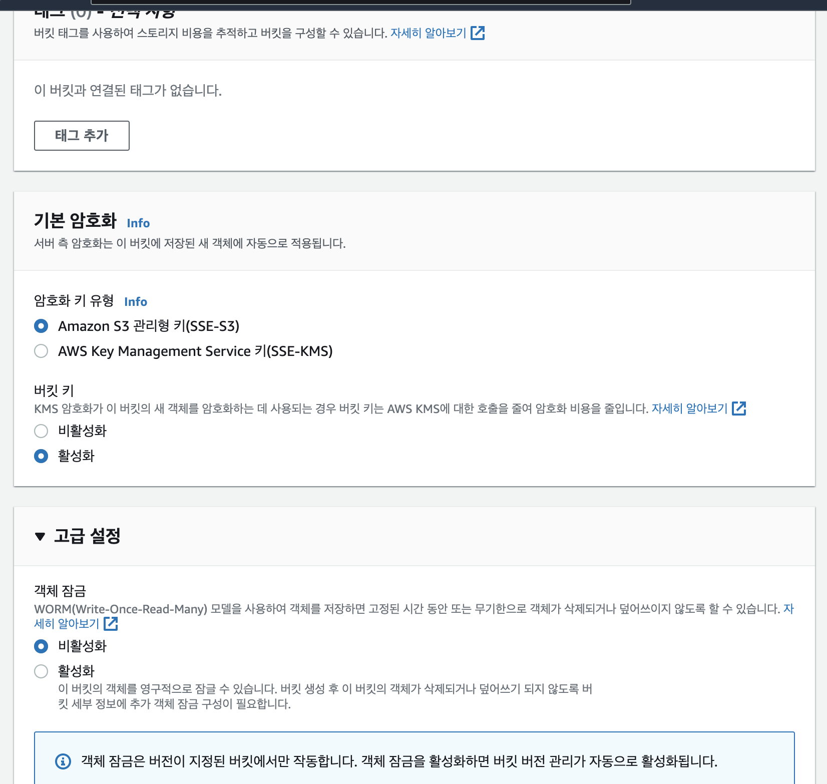 2. S3 버킷 생성- Resource를 저장하기 위한 S3 Bucket을 생성합니다. - 퍼블릭 액세스를 차단하여 미리 생성한 IAM 계정에게만 권한을 부여할 예정입니다.