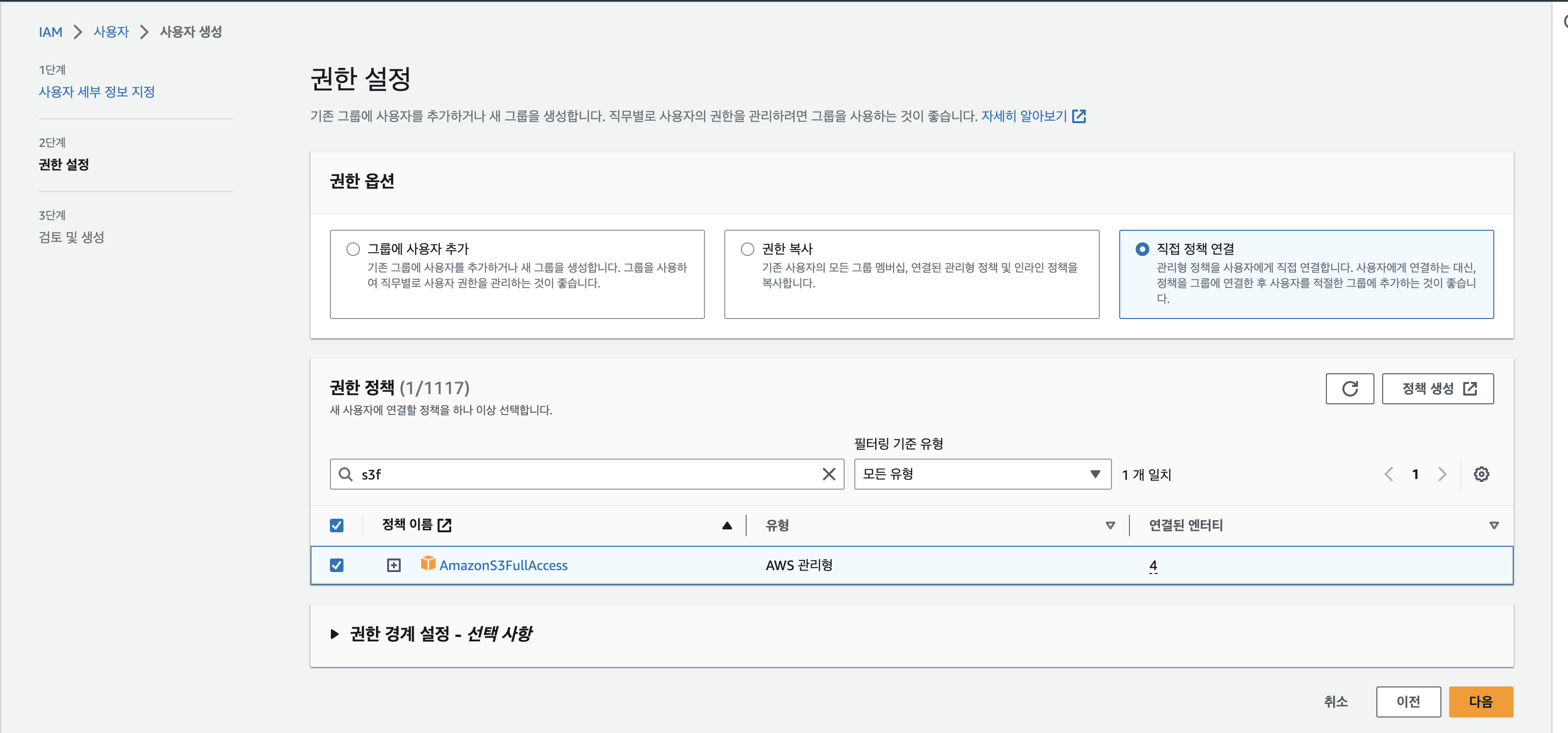 1. AWS IAM 계정 생성- Master 계정이 아닌 S3 업로드용 IAM 계정을 생성합니다.   AmazonS3FullAccess 권한을 적용합니다.