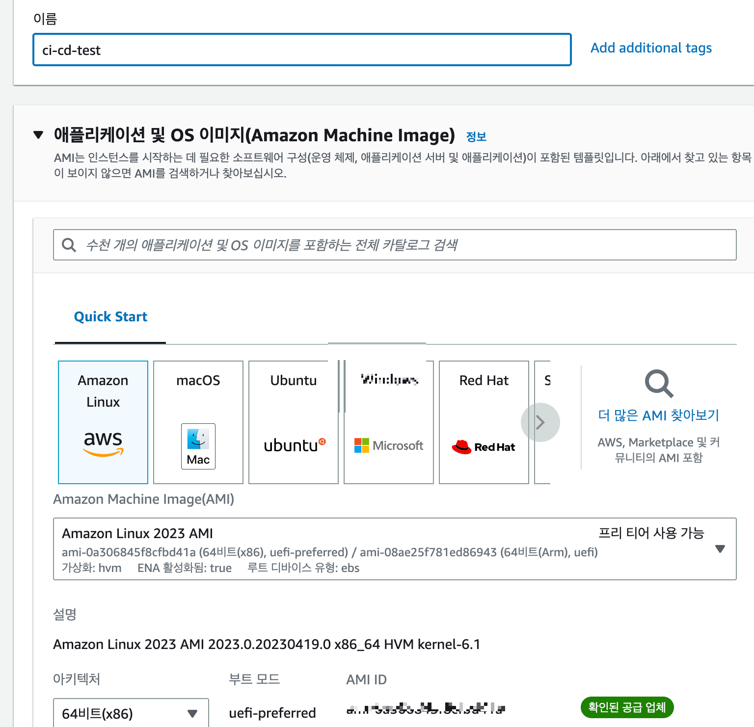 OS는 Amazon Linux 2023 AMI - 64 bit(x86) 를 선택합니다.