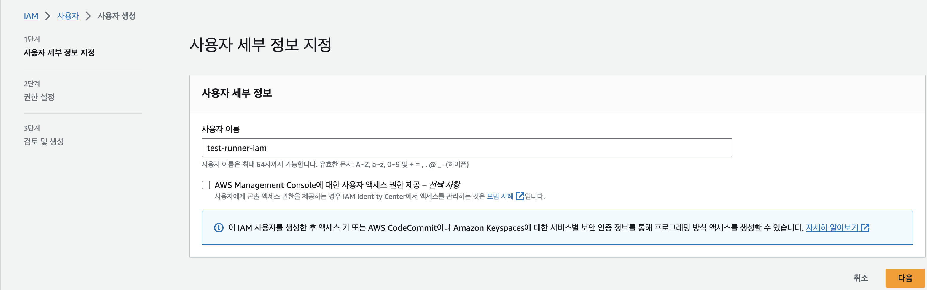 - 직접 콘솔을 접속할 일은 없기에 [AWS Management Console에 대한 사용자 액세스 권한 제공]은 체크하지 않았습니다.