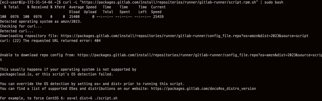 본 포스팅에선 Amazon Linux 2023 AMI EC2 환경에서 공식 문서에 나와 있는 아래 명령어로 gitlab-runner를 설치하려고 했으나,