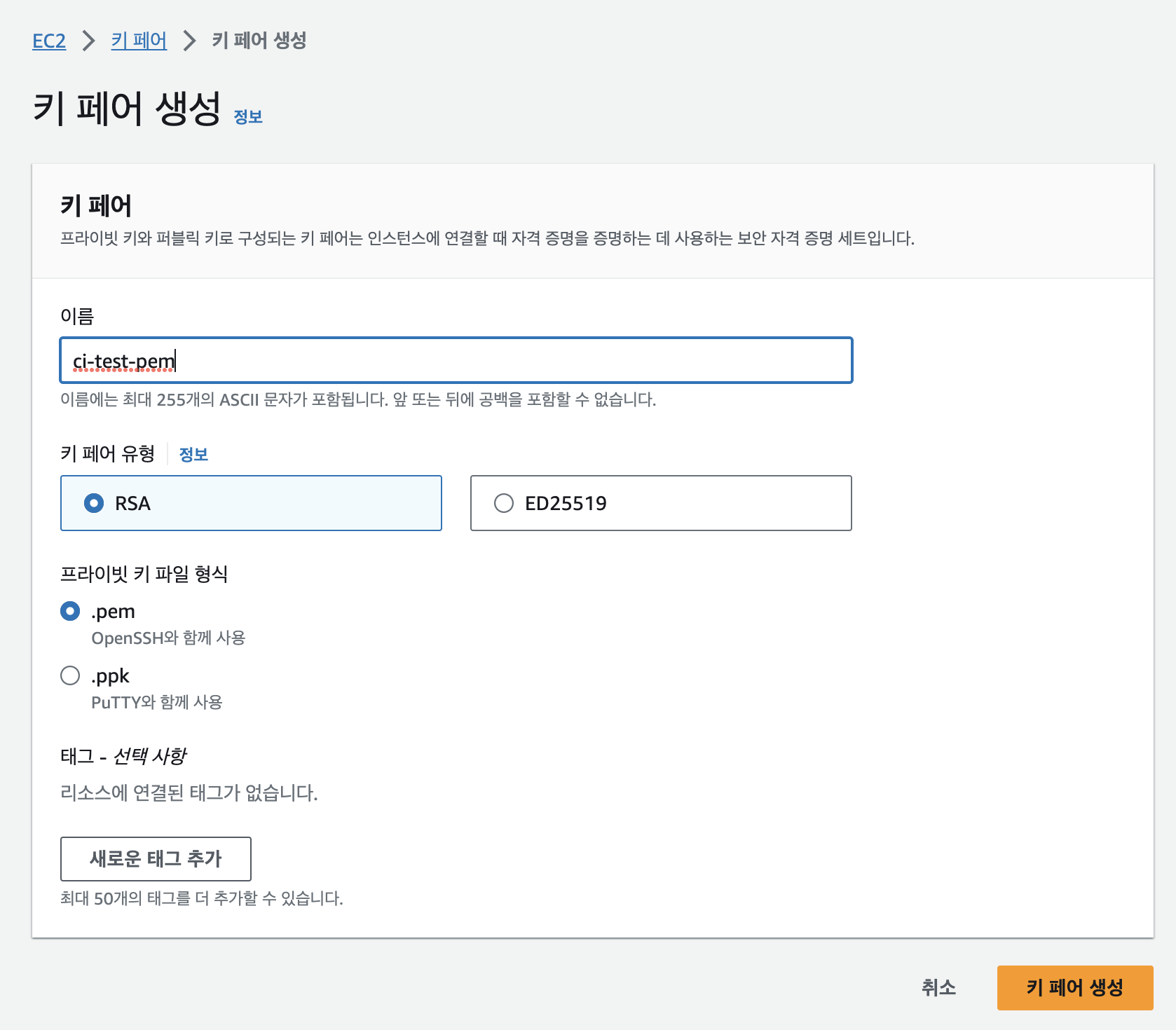 EC2 > 키 페어 메뉴에서, 키 페어를 미리 생성합니다. 해당 키 페어는 Gitlab Runner EC2 Server를 생성할 때 사용합니다.