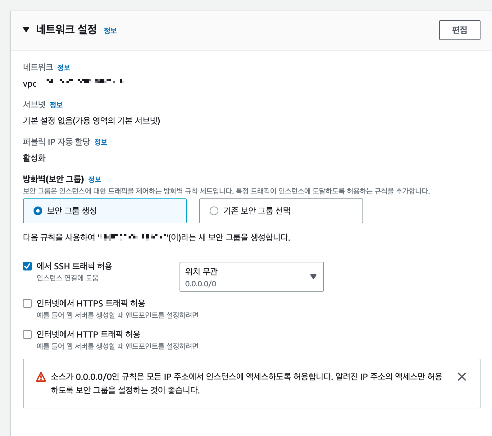 보안 그룹을 새로 생성하며 SSH 트래픽 허용을 체크해줍니다.