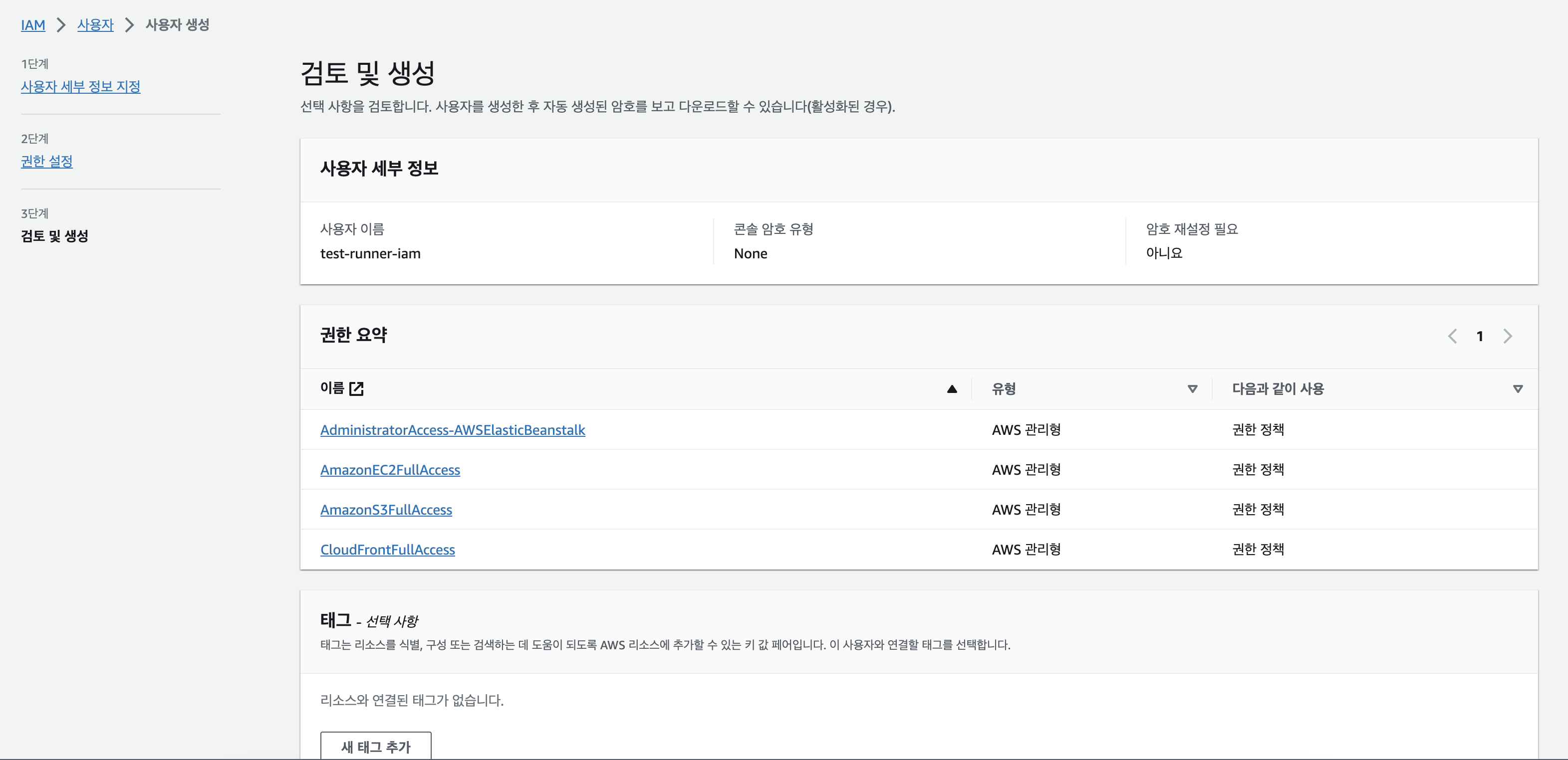 해당 포스팅에서는 추후 배포 파일을 S3에 업로드하고 ElasticBeanstalk에 배포할 예정이기 때문에 EB AdministratorAccess, S3 권한을 추가했으며, Gitlab runner EC2 Server에 접근하기 위해 EC2 FullAccess 권한을 추가 했습니다.