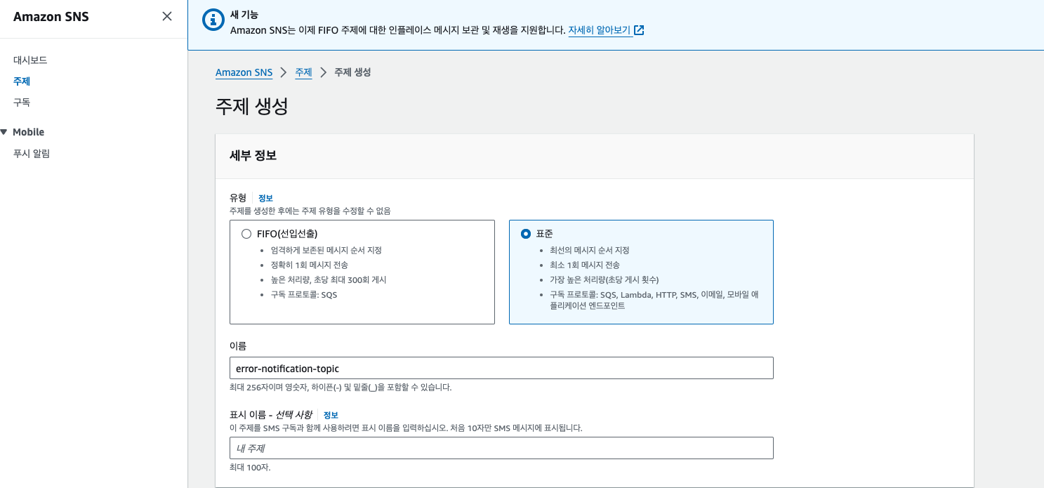이메일 방식을 사용할 것이기 때문에 표준을 선택하고, 주제 이름을 입력합니다.
