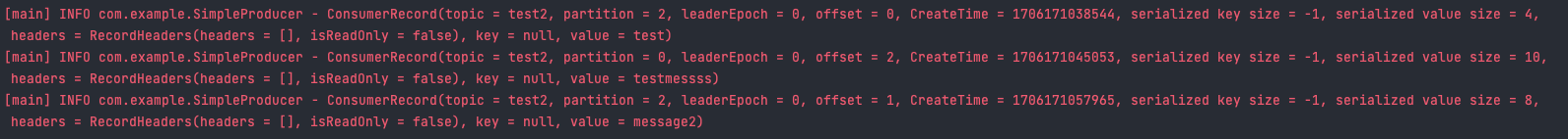 [main] INFO com.example.SimpleProducer - ProducerRecord(topic=test2, partition=null, headers=RecordHeaders(headers = [], isReadOnly = true), key=null, value=testMessage, timestamp=null)