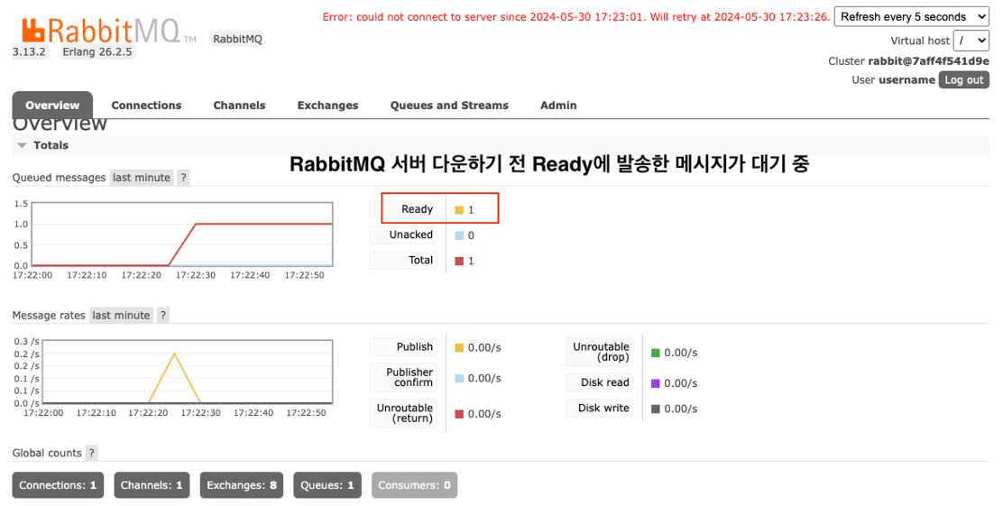 Publisher에서 메시지를 발송하였지만 Consumer의 연결이 끊긴 상태로 발송한 메시지가 대기 상태