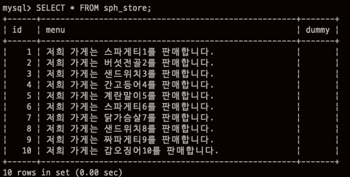 mysql에는 store라는 테이블이 존재하며, 스핑크스를 통해 인덱싱을 시킬 예정입니다.