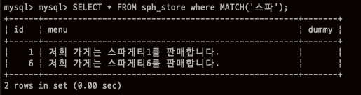 ... ############################################################################# ## source settings ## ############################################################################# common { datadir = /sphinx/sphinx-3.5.1/data/index/sph_store } source sph_store { type = mysql sql_host = mysql ip주소 (localhost) # docker container의 경우 127.0.0.1 sql_user = 계정명 sql_pass = 패스워드 sql_db = DB명 sql_port = 3306 sql_query_pre = SET NAMES utf8 sql_query = \ SELECT id, menu, dumy \ FROM store sql_field_string = menu sql_field_string = dumy }source 부분은 어떤 데이터를 인덱스 시킬것인지 설정하는 부분입니다.