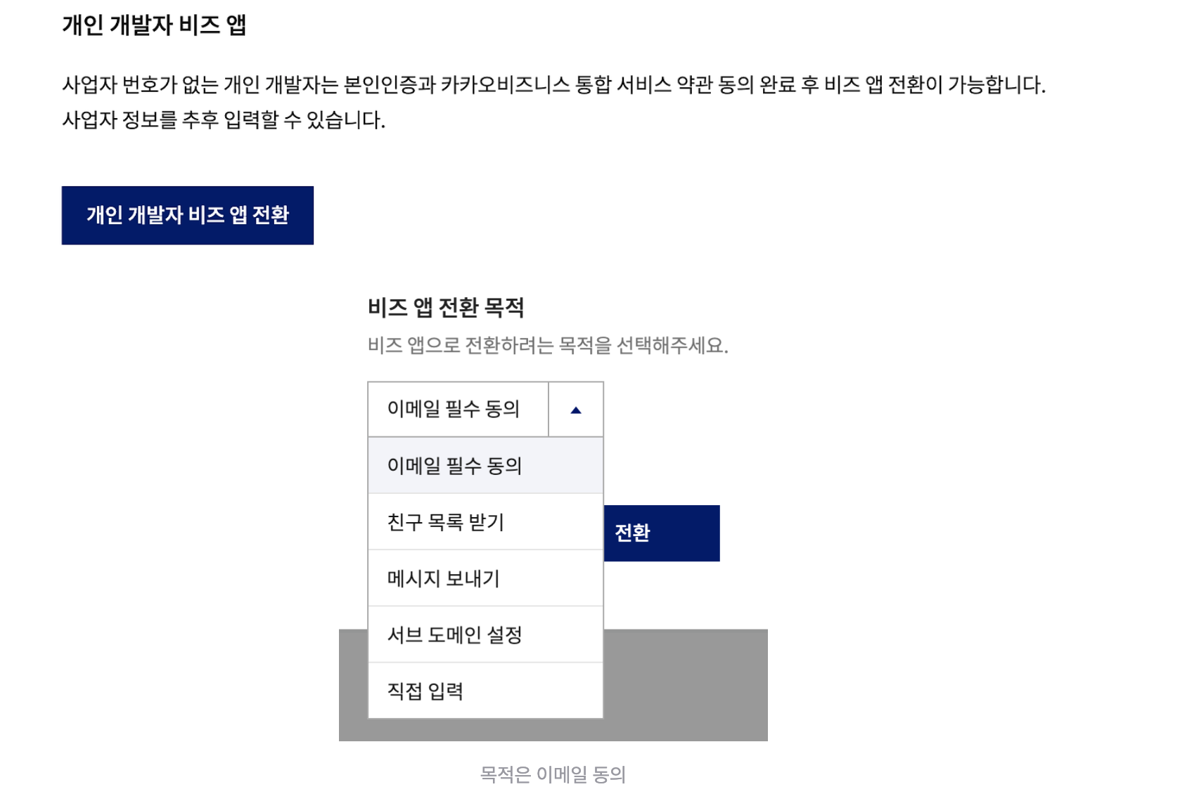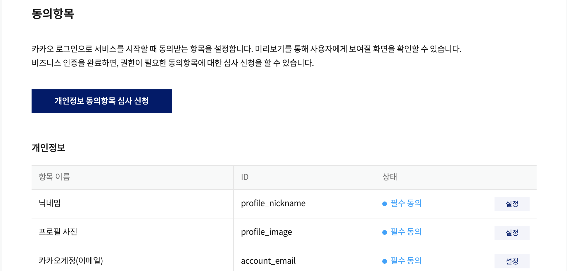 사업자 정보를 등록하거나, 비즈니스 인증(비즈앱 전환)을 완료하면, 권한이 필요한 동의항목에 대한 심사를 신청할 수 있습니다.