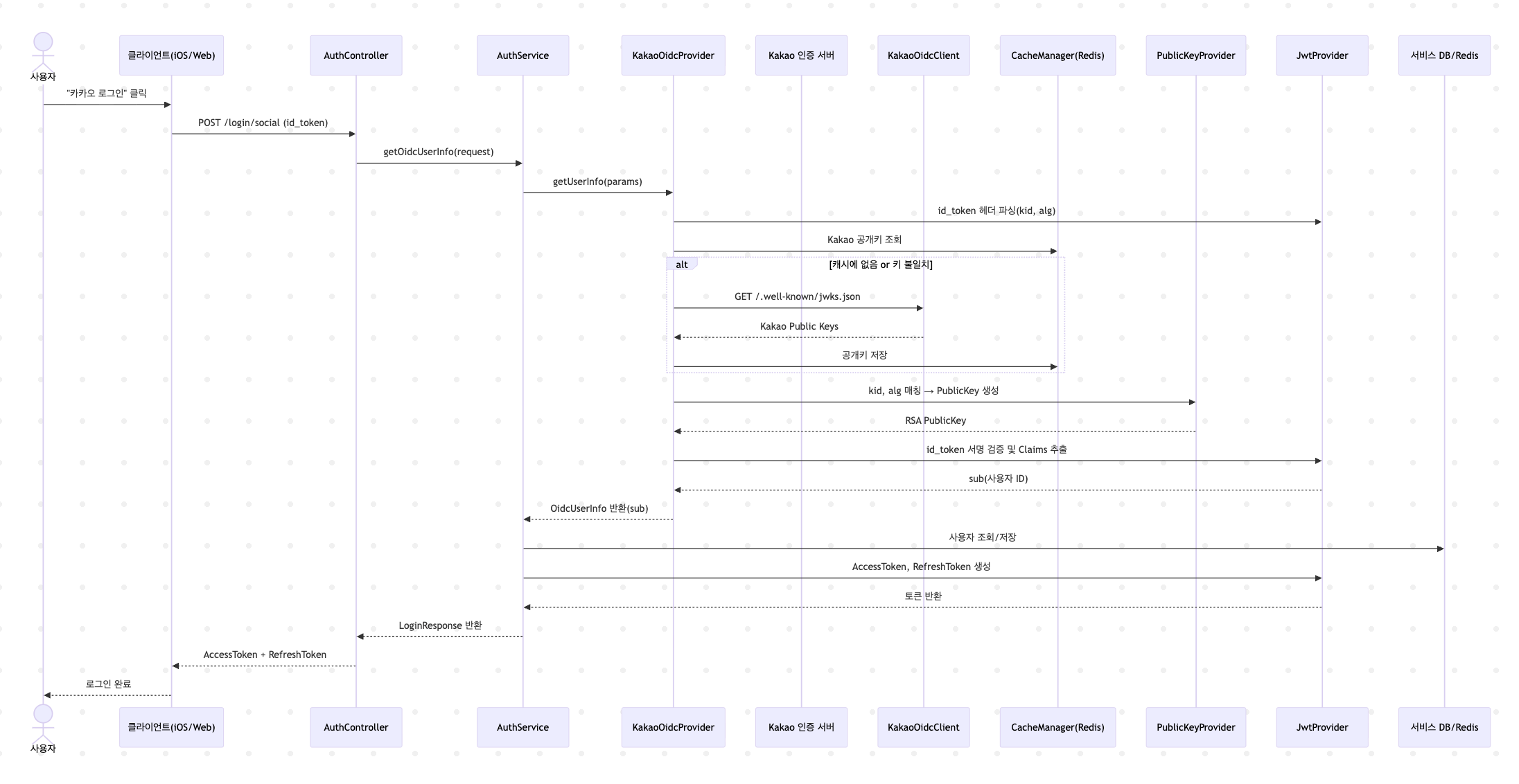 특히, Redis 기반 공개키 캐싱, 인터페이스 기반 확장성 설계(타 소셜 로그인 대비) 등을 담았으니